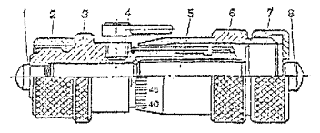 2 - микрометрический винт; 3 - гайка; 4 - нониус; 5 и 6 - губки нижние; 7 и 8 -