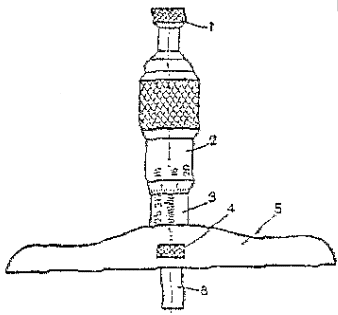 скоба; 2 - пятка; 3 - измерительная губка; 4 - микрометрический винт; 5 -
