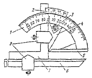 основание; 2 - нониус; 3 - стопор; 4 - сектор; 5 - линейка основания; 6 - линейка