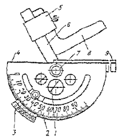 сектор; 2 - стопор; 3 - нониус; 4 - основание; 5 - державка; 6 - линейка