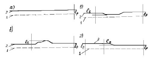 пучение; б - бугор пучения; в - впадина; г - перепад; 1 - положение дорожной одежды до пучения; 2 - то же, после