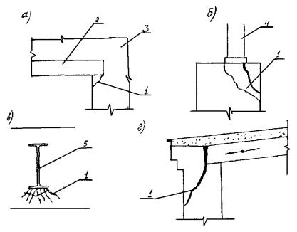трещины в отдельных узлах при опорных частях железобетонных ригелей и колонн