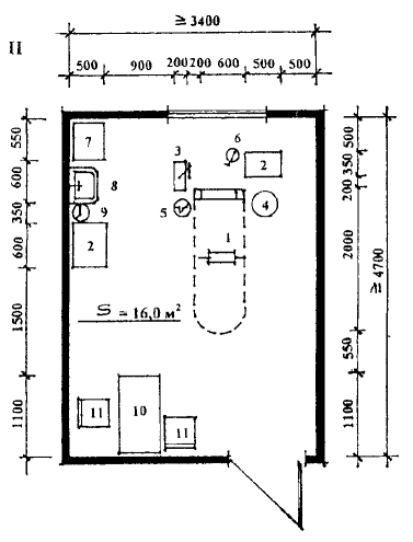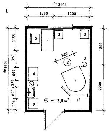 смотровая 7. Таблица 8. Шкаф медицинский 9. Умывальник 10. Бачок для