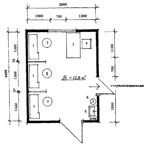Столик с аппаратурой 3. Столик с аппаратурой для приема процедур сидя 4. Стул 5. Стол врача 6. Шкаф медицинский 7. Умывальник Рис.