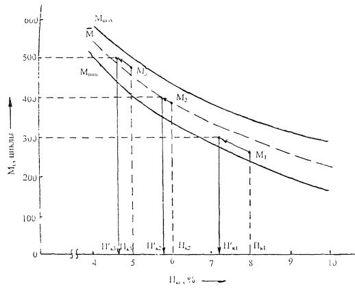 ось ординат и пунктирные линии). Кривые в первом и третьем случае ведут параллельно кривым соответственно Мmin и Mmax, а во втором -
