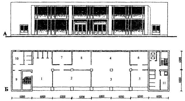 администратора с кассовым аппаратом, 10 - a капсула, 11 - витрина, 12 - подиум.