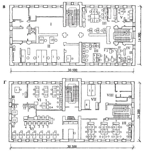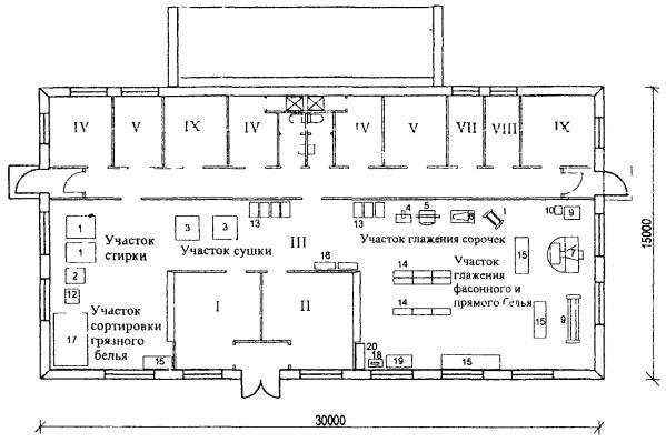 КОМИСАРЕНКО, Н. А. МОРОЗОВА) I - Помещение для посетителей (прием белья), II - помещение для посетителей (выдача белья), III - производственная группа помещений, IV - контора, V - кладовые (В-Ч), VI - гардеробные (мужская и женская), VII - компрессорная, VIII - ремонтно-механический пункт, IХ - венткамеры (приточная и вытяжная). Рабочая