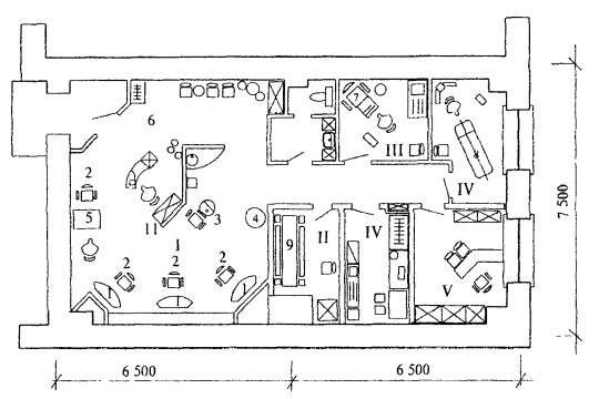 ТЕХНОЛОГИЧЕСКОГО ОБОРУДОВАНИЯ В САЛОНЕ КРАСОТЫ I - Салон для посетителей с гардеробом, II - зал парикмахерской, III - кабинет маникюра и педикюра, IV - массажный кабинет, V - косметический кабинет, VI - солярий, VII - демонстрационный зал с баром, раздевалкой и