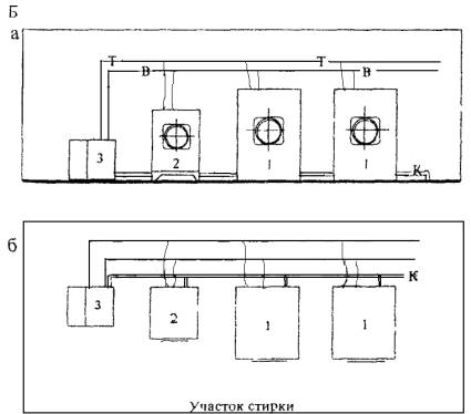 СТИРАЛЬНОГО ОБОРУДОВАНИЯ а - разрез, б - план 1 - машина стиральная емкостью 12 кг, 2 - машина стиральная емкостью 10 кг, 3 - мойка. РИС. 24. ПРИМЕР ОБОРУДОВАНИЯ МИНИ-ПРАЧЕЧНОЙ СХЕМА УСТАНОВКИ ГЛАДИЛЬНОГО