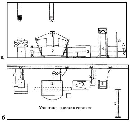 ОБОРУДОВАНИЯ ДЛЯ СОРОЧЕК а - фасад, б - план 1 - пресс для воротничков и манжет, 2 - паровоздушный манекен для сорочек, 3 - стол гладильный, 4 - упаковочная установка, 5 - вешало передвижное. РИС. 25. ПРИМЕР ПЛАНИРОВОЧНОГО