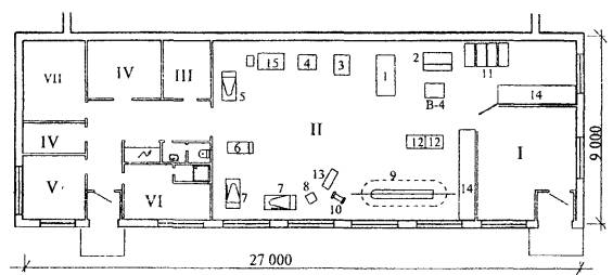 одежды, VII - закройный участок, VIII - гардеробная, IX - кладовые. 1 - столы для закройных работ, 2 - столы для