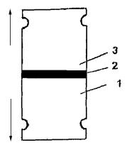 где mb - масса образца после заданной выдержки в воде, г; mc - масса образца сухого, г. За результат испытания принимают среднее арифметическое значение результатов двух параллельных определений. Результат округляют до 0,1 г. 7.7 Определение адгезии к бетону. Адгезию мастики к бетону определяют как прочность при разрыве по ГОСТ 21751 на образцах размером 40x40x80 мм или 50x50x80 мм. 7.7.1 Материалы и приспособления Плита бетонная (старый бетон) толщиной 40 мм. Плита должна быть очищена пескоструйной обработкой от поверхностных загрязнений с последующим обдуванием сжатым воздухом под давлением 6 атм. Свежеприготовленная на безусадочном цементе бетонная смесь. Подвижность смеси по осадке конуса должна быть 5 - 6 см. Проба мастики с добавкой безусадочного цемента в количестве 0,5 % массы мастики, приготовленная по 7.2. Металлическая насадка высотой 40 мм. Аппарат для торкретирования. Пригруз Руд = 6 кгс/см. Алмазная пила для нарезки образцов. Кисть или шпатель. 7.7.2 Порядок изготовления образцов. 7.7.2.1 Для изготовления образцов используют материалы по 7.7.1. 7.7.2.2 На подготовленную бетонную плиту наносят шпателем или кистью мастику слоем до 1 мм, устанавливают специальную металлическую насадку высотой стенок 40 мм и производят торкретирование под давлением 6 атм. свежеприготовленной бетонной смесью. Вместо торкретирования можно использовать пригруз Руд = 6 кгс/см2, укладываемый на свежеуложенную бетонную смесь. Высота торкретированного или уложенного слоя бетонной смеси должна быть 40 мм. 7.7.2.3 Изготовленный бетонный слой «новый бетон» должен твердеть в течение 28 суток в нормально-влажностных условиях, при температуре (20 ± 3/2) °С и относительной влажности 100 %. 7.7.2.4 После отверждения плиту нарезают алмазной пилой на образцы размером 40x40x80 мм или 50x50x80 мм с пропиленными бороздками для захвата образцов разрывной машиной (рисунок 1). Рисунок 1 - образец 1 - старый бетон; 2 - мастика; 3 - новый