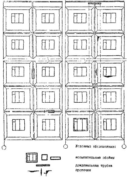 зданий с указанием мест размещения испытательных обойм, дождевальных трубок,