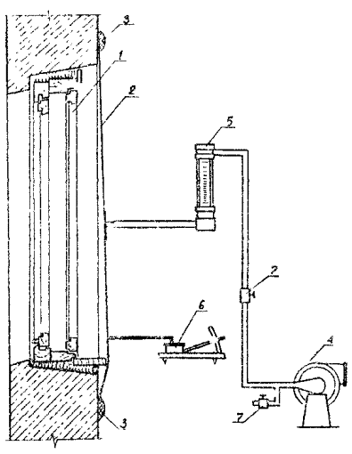 герметизирующая мастика; 4 - вентилятор; 5 - ротаметр; 6 - микроманометр; 7 -