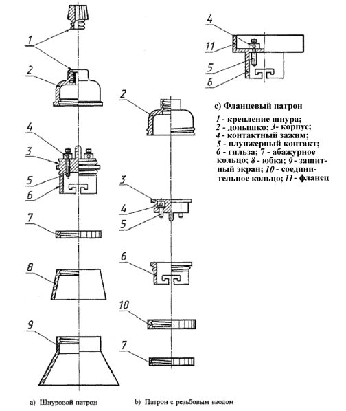 доступна для прикосновения стандартным испытательным пальцем по МЭК 60529. 2.1.2 керамический патрон: Патрон, наружные детали которого полностью изготовлены из керамики (см. примечание к 2.1.1). 2.1.3 металлический патрон: Патрон, наружные детали которого полностью или частично изготовлены из металла (см. примечание к 2.1.1). 2.2 Способы крепления2.2.1 шнуровой патрон: Патрон с устройством фиксации гибкого шнура, на котором патрон может быть подвешен (см. рисунок 4а). 2.2.2 патрон с резьбовым вводом: Патрон, имеющий в отверстии ввода провода деталь с резьбой, позволяющую соединять патрон с сопряженной резьбовой поддержкой (прежнее название - ниппельный патрон) (см. рисунок 4b). 2.2.3 фланцевый патрон: Патрон, конструкция которого позволяет устанавливать его посредством присоединенного или выполненного заодно с ним фланца непосредственно на опорной поверхности или в соответствующем блоке (см. рисунок 4с). 2.3 сборка зажим/контакт: деталь или сборка деталей, обеспечивающих электрическое соединение сетевых проводов с контактной поверхностью соответствующего цоколя лампы, а также создающих надежное контактное давление. Сборка может быть: a) подвижного типа, когда контактный зажим может перемещаться параллельно оси лампы при вставлении цоколя лампы; b) неподвижного типа, когда контактный зажим при вставлении цоколя лампы не перемещается. Примечание - Контактный зажим и гильзы могут