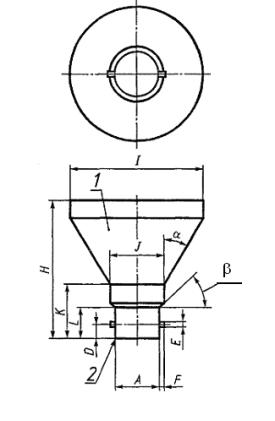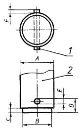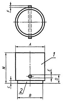 Толщина стенки I = 1,5 мм может быть уменьшена вблизи отверстия. * См. примечание 1. ** см. примечание 2. Рисунок 9 - Размеры защитного экрана для патронов B22d (см. 9.1) 1 - шпилька; может быть металлической; 2 - изоляционный материал;
