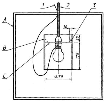 провода; 3 - фланец; А. Испытательная камера Материал: фанера номинальной толщиной 10 мм. Внутренняя отделка: окраска двумя слоями матовой краски. Внутренние размеры: [(500 ´ 500 ´ 500) ± 10] мм. Одна стенка должна сниматься. Минимальные расстояния от стены камеры до испытательного цилиндра: - горизонтальные - 150 мм; - вертикальные: сверху - 300 мм; снизу - 500 мм. Примечание - Испытательная