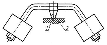 мм; 2 - образец Рисунок 17 - Испытательное устройство для вдавливания шарика Радиус сферы сжимающих головок 20 мм 1 -