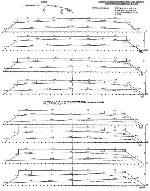 Переход от двухскатного поперечного профиля к односкатному с уклоном виража. 25