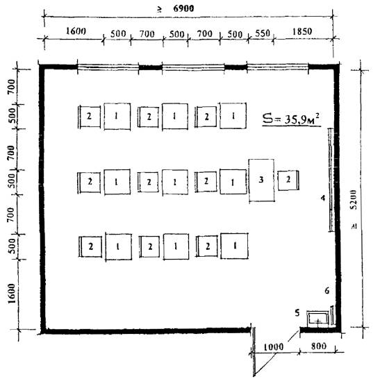 ПРИЛОЖЕНИЯЭКСПЛИКАЦИЯ ОБОРУДОВАНИЯ 1. Стол ученический 2. Стул 3. Стол учителя 4. Классная доска 5. Умывальник 6. Вешалка для полотенца Рис. П.1. Класс на 9 учащихся. ЭКСПЛИКАЦИЯ ОБОРУДОВАНИЯ 1. Стол ученический 2. Стол ученический с