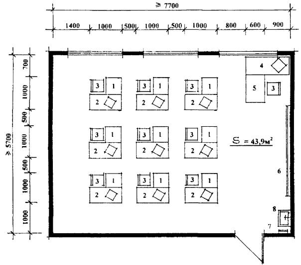 физикой и химией (I) с лаборантскими (II) и (III) ЭКСПЛИКАЦИЯ ОБОРУДОВАНИЯ 1. Стол 2. Стул 3. Стол специалиста 4. Компьютерный стол специалиста 5. Классная доска 6. Компьютер 7. Вешалка для полотенца 8. Умывальник 9. Ученический компьютерный стол 10. Комбинированный шкаф Рис. П.5. Компьютерный класс основной и старшей школы. ЭКСПЛИКАЦИЯ ОБОРУДОВАНИЯ 1. Стол-шкаф кухонный 2. Холодильник 3. Мойка 4. Плита 5. Сервировочная стойка с