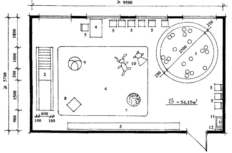 с компьютером 5. Стол специалиста 7. Вешалка для полотенца 8. Умывальник Рис. П.2. Компьютерный класс начальной школы. ЭКСПЛИКАЦИЯ ОБОРУДОВАНИЯ 1. Сухой бассейн 2. Горка 3. Скамья 4. Стол специалиста 5. Стул 6. Ковер 7. Мяч массажный 8. Мягкий модуль 9. Мяч 10. Мягкие игрушки 11. Умывальник 12. Вешалка для полотенца Рис. П.3. Игровая начальной школы на 18 воспитанников. ЭКСПЛИКАЦИЯ ОБОРУДОВАНИЯ I. КАБИНЕТ 1. Стол ученический-лабораторный 2. Стул ученический 3. Стол демонстрационный 4. Стул учительский 5. Мойка (умывальник) 6. Бак для мусора 7. Классная доска 8. Комбинированный шкаф II. III. ЛАБОРАНТСКИЕ 9. Шкаф-стеллаж 10. Вытяжной