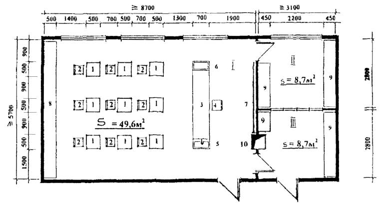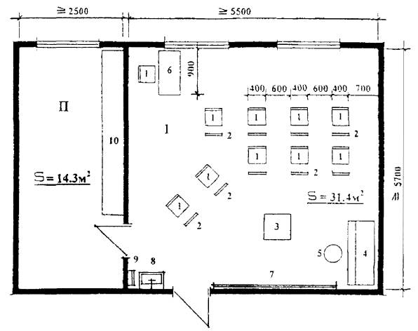ЭКСПЛИКАЦИЯ ОБОРУДОВАНИЯ I. КОМНАТА 1. Стул 2. Пюпитр 3. Помост для преподавателя 4. Пианино 5. Табурет винтовой 6. Стол преподавателя 7. Классная доска 8. Умывальник 9. Вешалка для полотенца II. КЛАДОВАЯ 10. Комбинированный шкаф Рис. П.9. Комната музыкальных