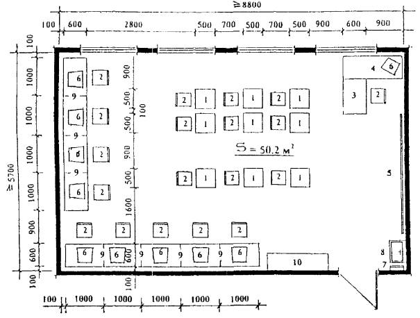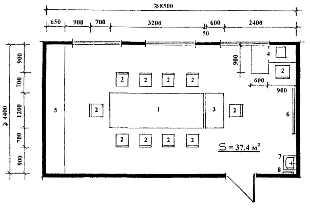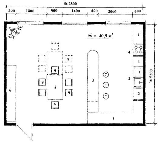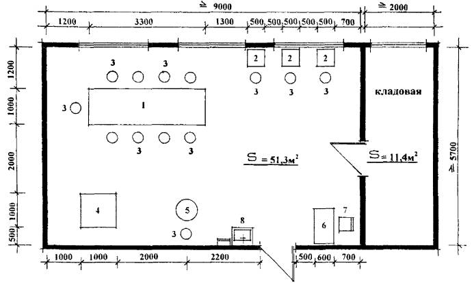 разделочным столом 6. Комбинированная стенка 7. Табурет 8. Обеденный стол 9. Стул Рис. П.6. Мастерская кулинарного творчества. ЭКСПЛИКАЦИЯ ОБОРУДОВАНИЯ 1. Рабочий стол 2. Стол для индивидуальной