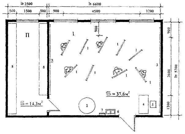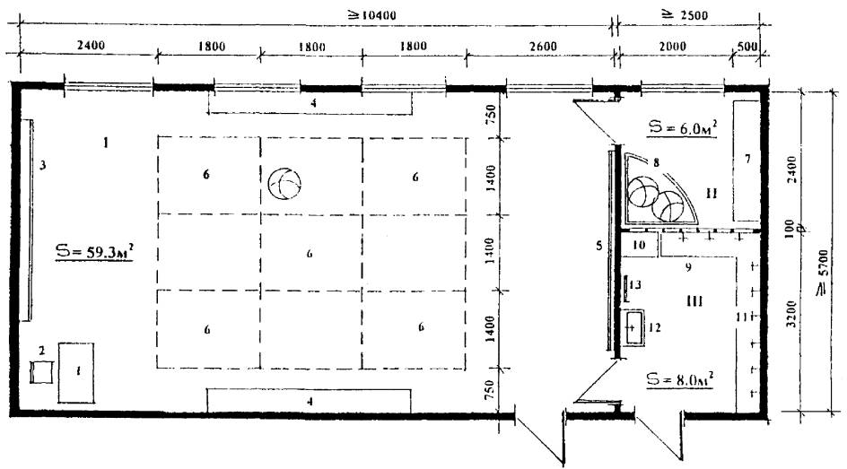 приема процедур сидя 4. Стул 5. Стол врача 6. Шкаф медицинский 7. Умывальник 8. Вешалка для полотенца Рис. П.15. Кабинет физиотерапии. ЭКСПЛИКАЦИЯ ОБОРУДОВАНИЯ I. ЗАЛ 1. Стол методиста 2. Стул методиста 3. Шведская стенка 4. Скамья 5. Зеркало 6. Маты для занятий II. КЛАДОВАЯ 7. Комбинированный шкаф 8. Манеж для складирования мячей III. РАЗДЕВАЛКА 9. Скамья для переодевания 10. Шкаф методиста 11. Крючки для одежды 12. Умывальник 13. Вешалка для полотенца Рис. П.16. Кабинет групповых занятий ЛФК с кладовой и раздевалкой ЭКСПЛИКАЦИЯ ОБОРУДОВАНИЯ 1. Стол 2. Стул 3. Стол специалиста 4. Кресло 5. Шкаф-стеллаж 6. Умывальник 7. Вешалка для полотенца Рис. П.17. Кабинет групповой психотерапии на 9 человек. ЭКСПЛИКАЦИЯ ОБОРУДОВАНИЯ 1. Рабочий стол 2. Стул 3. Стол специалиста 4. Компьютерный стол специалиста с компьютером 5. Стеллаж 6. Ученическая доска 7. Умывальник 8. Вешалка для полотенца Рис. П.18. Зал ситуационных игр. ЭКСПЛИКАЦИЯ ОБОРУДОВАНИЯ 1. Стол