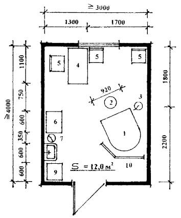 для полотенца II. КЛАДОВАЯ 8. Комбинированный шкаф Рис. П.10. Изостудия с кладовой ЭКСПЛИКАЦИЯ ОБОРУДОВАНИЯ I. КАБИНЕТ ГИНЕКОЛОГА-ВЕНЕРОЛОГА 1. Кресло гинекологическое 2. Винтовой табурет 3. Передвижной светильник 4. Стол врача 5. Стул 6. Столик инструментальный 7. Бачок для мусора 8. Умывальник 9. Шкаф медицинский 10. Ширма Рис. П.11. Кабинет гинеколога-венеролога. II. КАБИНЕТ СТОМАТОЛОГА 1. Кресло стоматологическое 2. Столик инструментальный 3. Установка стоматологическая