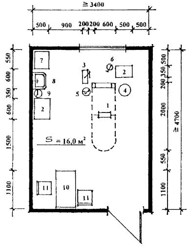 универсальная 4. Винтовой табурет 5. Плевательница 6. Светильник 7. Шкаф медицинский 8. Умывальник 9. Бачок для мусора 10. Стол врача 11. Стул Рис. П.12. Кабинет стоматолога. ЭКСПЛИКАЦИЯ ОБОРУДОВАНИЯ 1. Стол врача 2. Стул 3. Столик с набором линз для