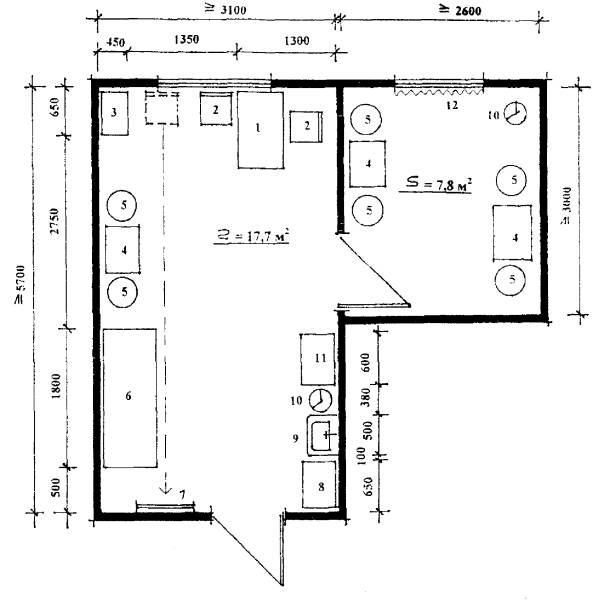 проверки остроты зрения 4. Офтальмологические установки 5. Табурет винтовой 6. Кушетка смотровая 7. Таблица 8. Шкаф медицинский 9. Умывальник 10. Бачок для мусора 11. Столик инструментальный 12. Светозащитная штора Рис. П.13. Кабинет офтальмолога с темной комнатой. ЭКСПЛИКАЦИЯ ОБОРУДОВАНИЯ 1. Стационарная ингаляционная установка 2. Винтовой