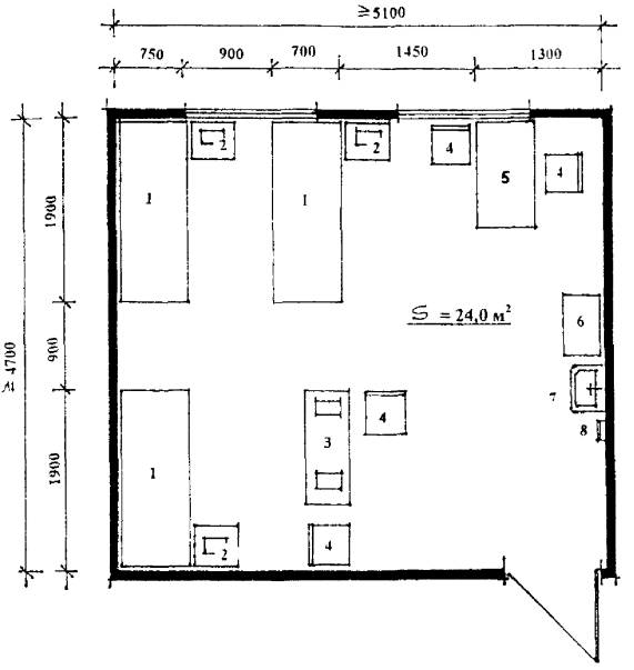 Гостиная. 7. Комната дежурного воспитателя. 8. Гардеробная. Условные обозначения: 5.88. В жилых группах санитарные узлы проектируются обособлено от жилых комнат с целью осуществления необходимого надзора. Рекомендуемый состав оборудования санитарного узла: унитаз, умывальник. Рекомендуемый состав душевой: душ (I душевая сетка), вешалка, умывальник, скамья для раздевания, умывальник. В секции для мальчиков в состав оборудования санитарного узла следует включать писсуар. В секции для девочек - бидэ. 5.89. Оборудование гостинной должно быть