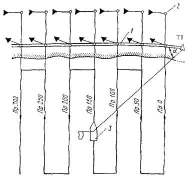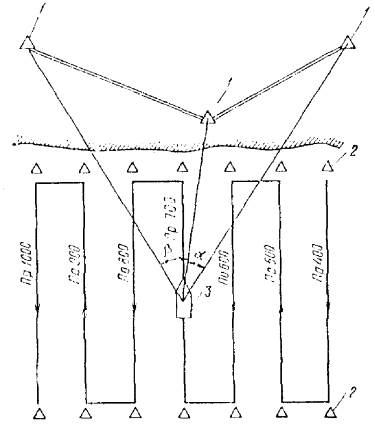 Интерполяционная палетка Прокладываемый отсчет интерполируется по лучам палетки и накаливается на перпендикуляре. Черт. 2. Нахождение положения заданной точки: 1 - изолинии сеток, нанесенных на планшет; 2 - интерполяционная палетка; 3 - перпендикуляр к средней изолинии, проведенный на планшете Нахождение положения заданной точки на плане с помощью