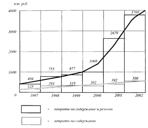 затраты на содержание возрастают, достигая уровня 1,0 - 1,2 млрд. р. (в 2001 г.