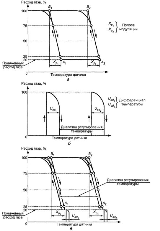 типичных характеристик расхода термостатов: а - модулирующего, б - двухпозиционного, в - комбинированного Для каждой температурной
