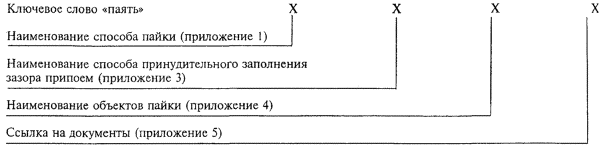 («паять» или «лудить»); - наименование способа пайки или лужения; - наименование объектов пайки или лужения. Наименование объектов не указывается, если они не