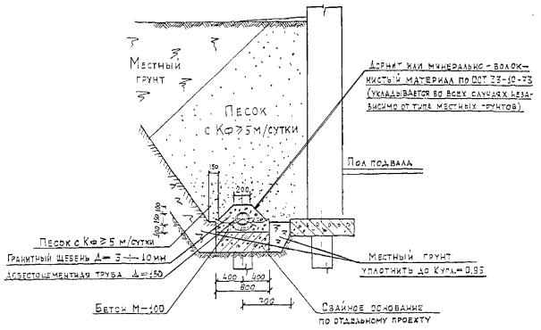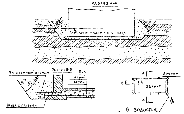 грунтовыми водами должны предусматриваться дренажи. Конструкции дренажей и устройство гидроизоляции подземной части