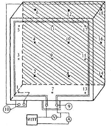 заштрихованной стороне __К__ - константановый провод __М__ - медный провод V - вольтметр А - амперметр ИПТ - источник постоянного тока Примечание - После сварки термопары батареи разводятся по лицевой и обратной