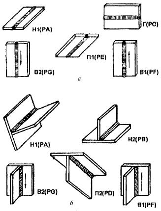 Рис. 1. Положения при сварке стыковых (а) и тавровых (б)