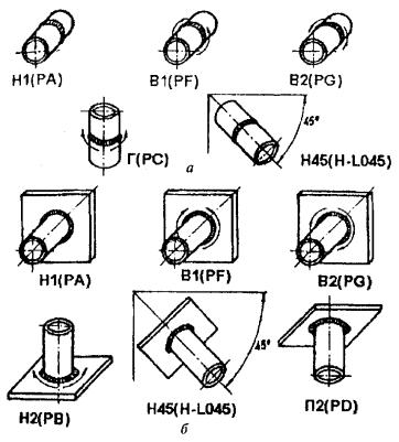 тавровых соединений Рис. 2. Положения при сварке стыковых (а) и угловых (б) соединений труб: H1 - нижнее при горизонтальном