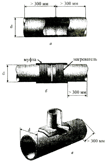 б - соединение муфтой; в - соединение седловым ответвлением Рис. 8. Контрольное сварное соединение типа Р Рис. 9. Контрольные сварные соединения типов V; X Рис. 10. Контрольные сварные соединения типов ТБ; TV; TX Рис. 11. Контрольное