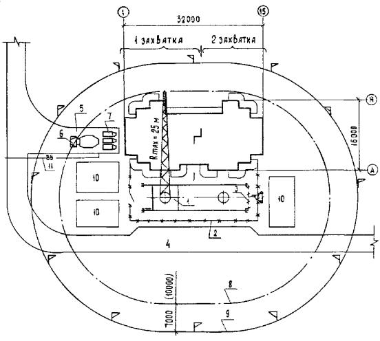 зона действия крана; 9 - опасная зона; 10 - площадка для складирования