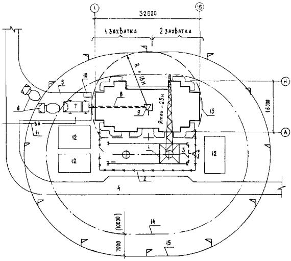 действия распределительной стрелы; 14 - зона действия башенного крана; 15 -