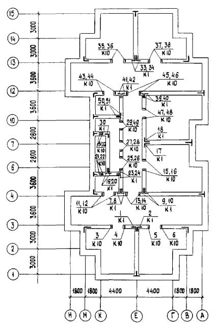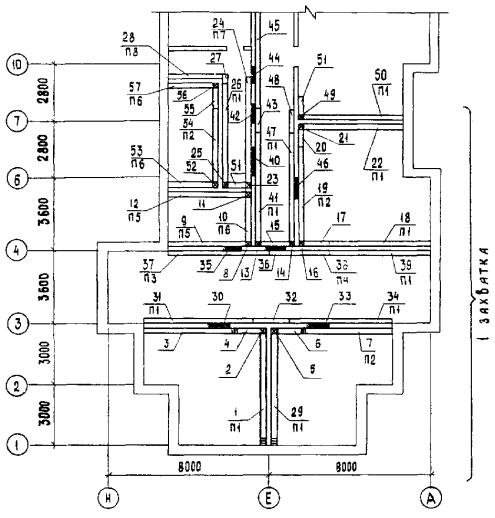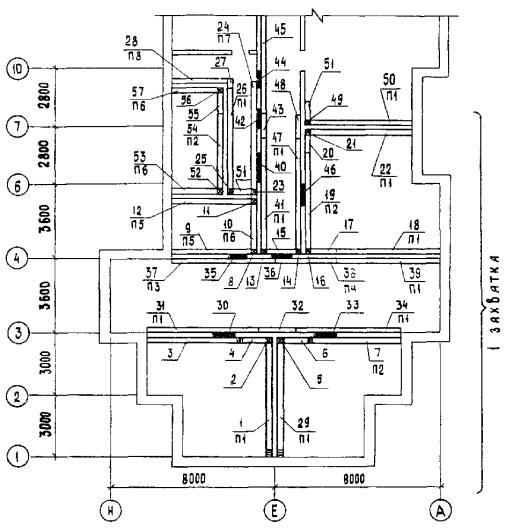 1, 2, 3 … 57 - последовательность монтажа опалубки П1;
