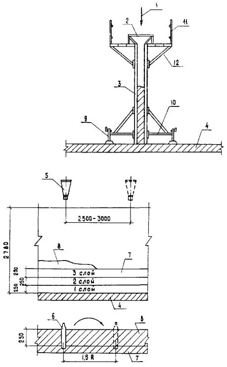 1 - направление подачи бетона 2 - приёмная воронка 3 - опалубочная панель 4 - перекрытие 5 - бадья с керамзитобетоном 6 - рабочий орган вибратора 7 - ранее уложенный слой 8 - укладываемый слой 9 - домкрат 10 - подкос 11 - ограждение настила 12 - кронштейн настила