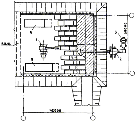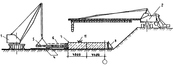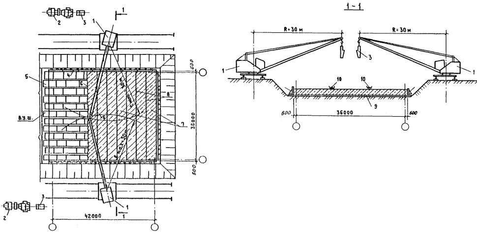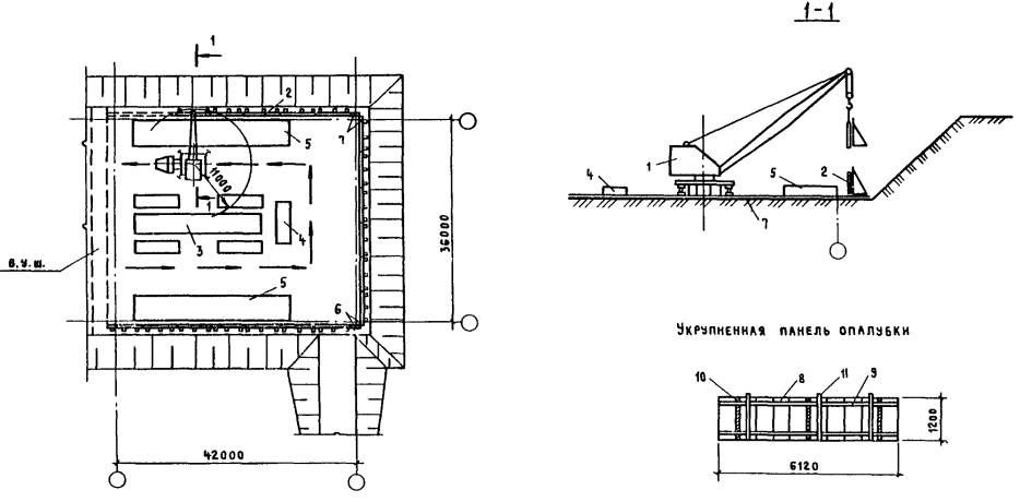 автомобильный кран КС-2561Д; 2 - укрупненные элементы опалубки; 3 - склад