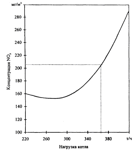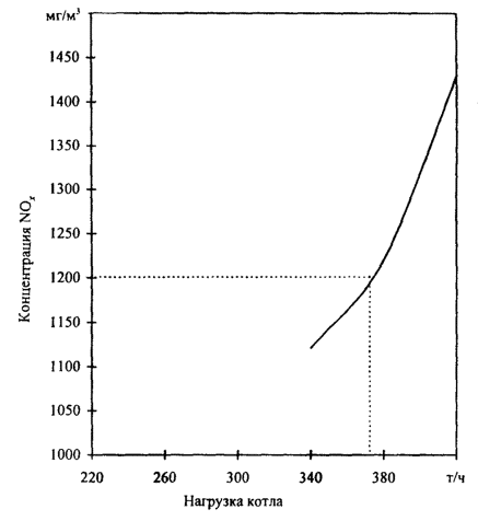 Зависимость концентрации оксидов азота от нагрузки котла при сжигании угля