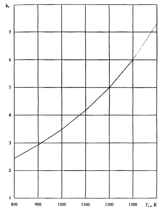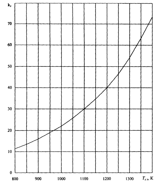 Рисунок Д.2 - Зависимость коэффициента kт от температуры газов перед турбиной для высокофорсированных
