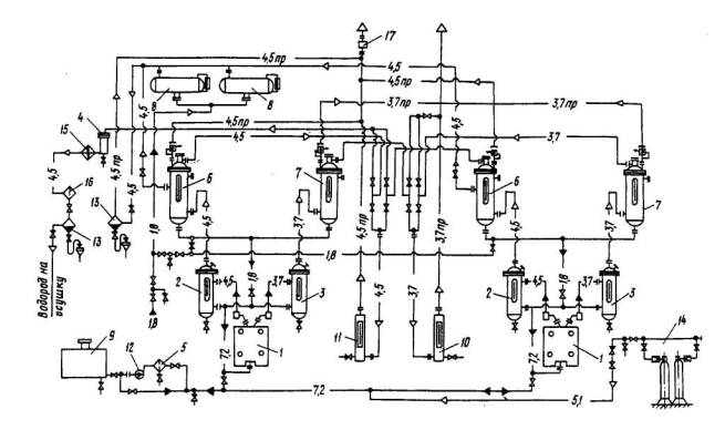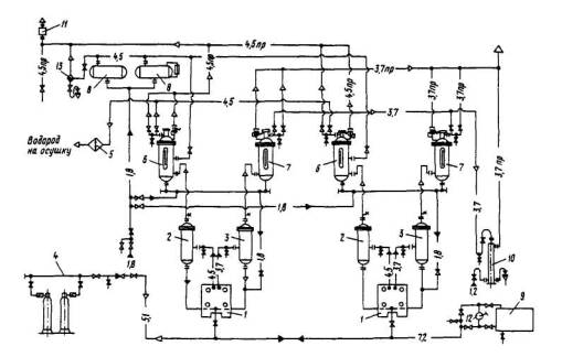водорода; 12 - насос; 13 - сборник конденсата; 14 - азотная рампа; 15 -